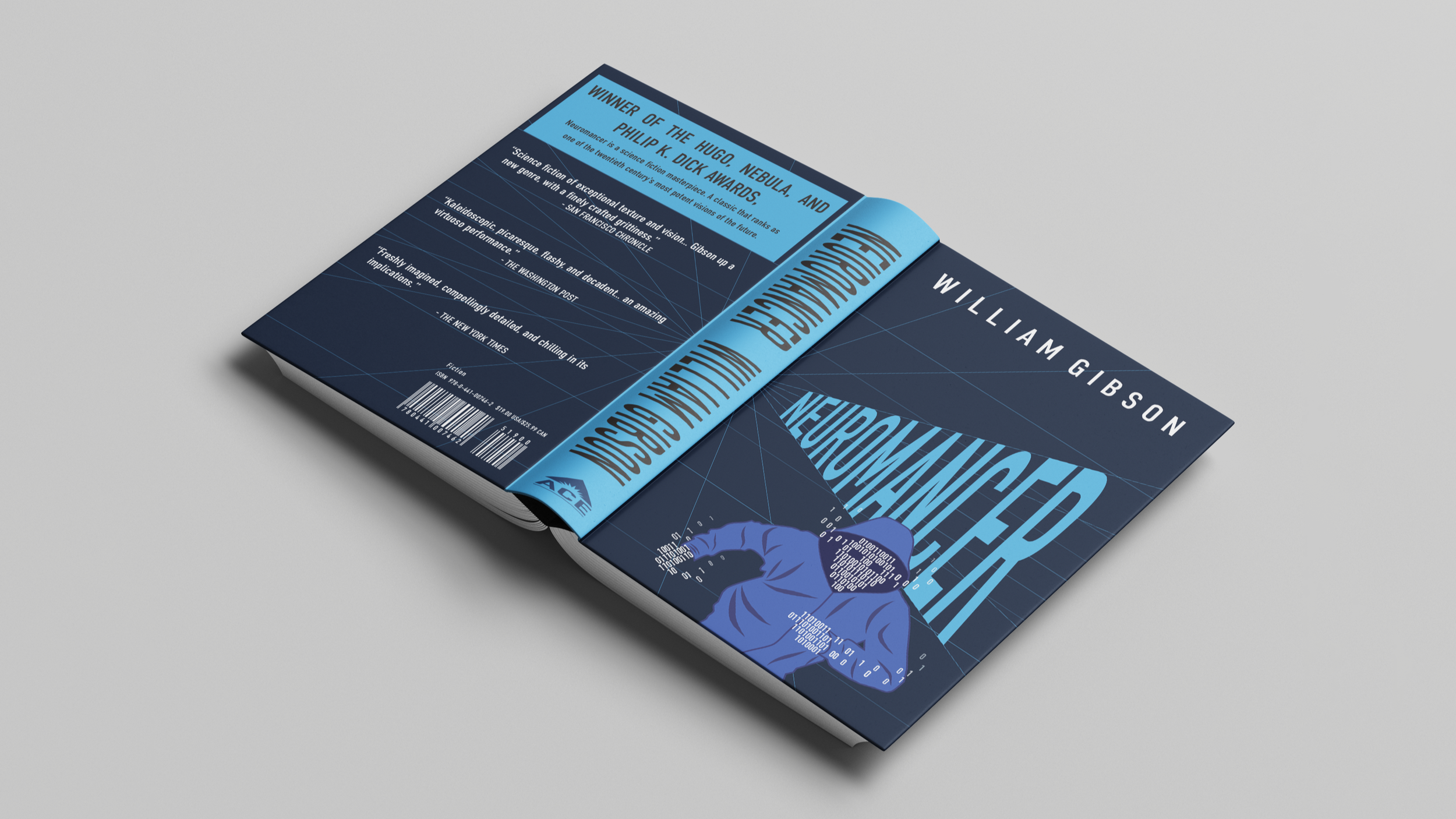 Inspired by concept art, I used perspective lines to create my interpretation of "cyberspace", the setting for Neuromancer. I developed this book cover first, incorporating this system, and followed suit with the rest of the books after.