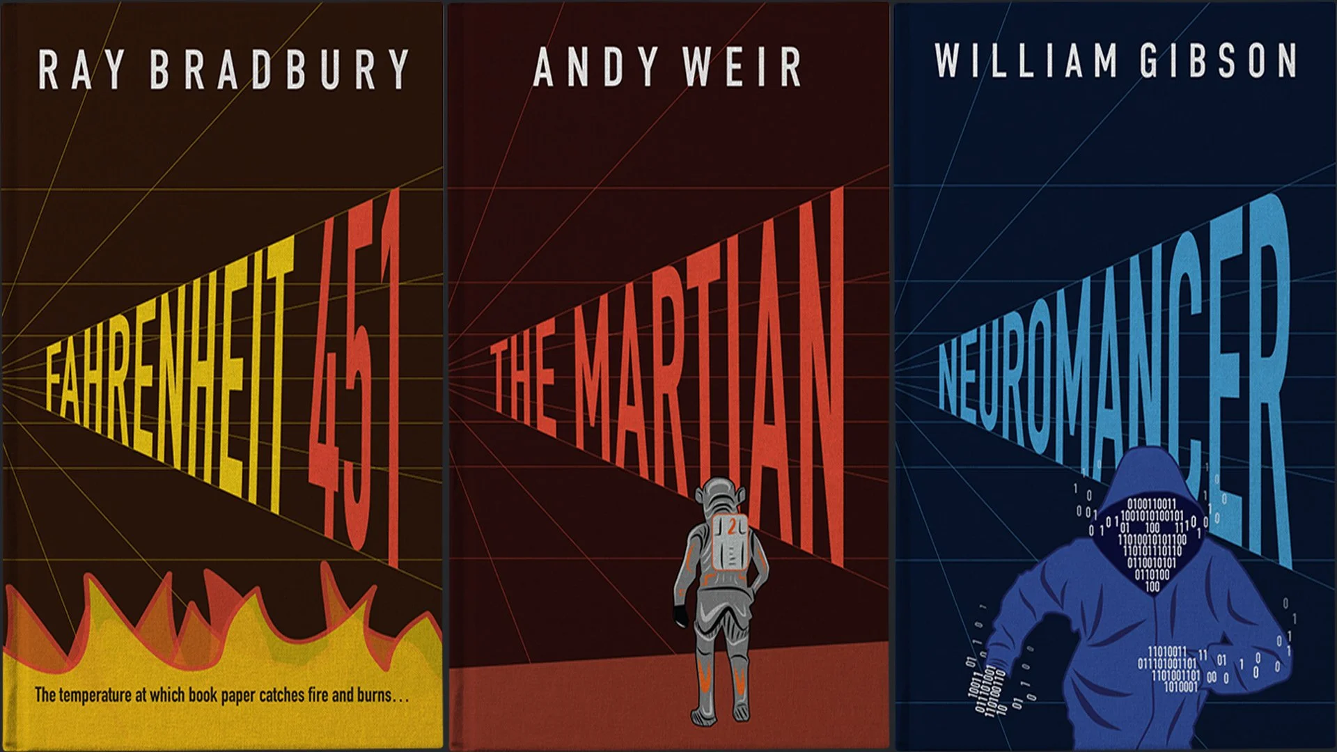 The theme of this book cover series is "Future". Series includes: Ray Bradbury's Fahrenheit 451, Andy Weir's The Martian, and William Gibson's Neuromancer.